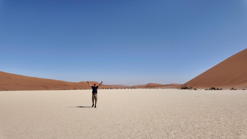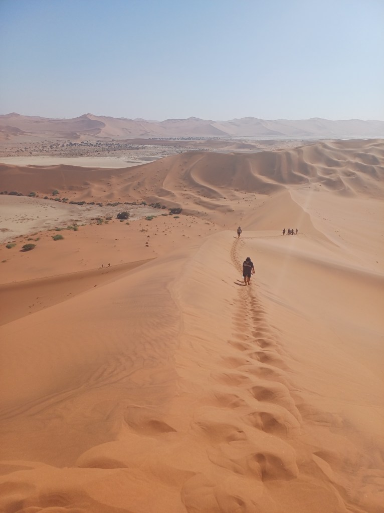 Day 8 is an early start. We are climbing Big Daddy, the 2nd highest dune in Namibia and 8th highest in the world, and we need to be there by 9ish. You simply can’t climb Big Daddy in the heat of the day. It was hard going but well worth it, especially running down off the dune and dropping into the Deadvlei white clay pan. Here you find spooky dead camel thorn trees. We are totally knackered that night and too tired for the 9pm scorpion spotting walk that the lodge organise. We do manage a bit of star gazing.